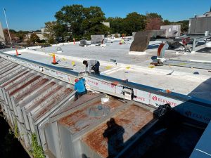 New roof drains, parapet wall adjustments, flashing, trim, walk pads, expansion joints, and 25 new exhaust fans.