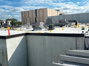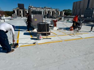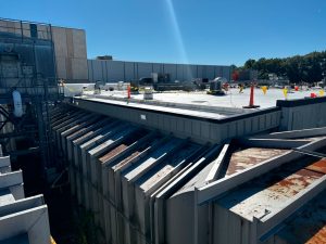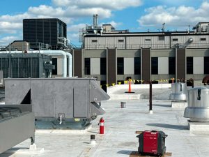 New roof drains, parapet wall adjustments, flashing, trim, walk pads, expansion joints, and 25 new exhaust fans.